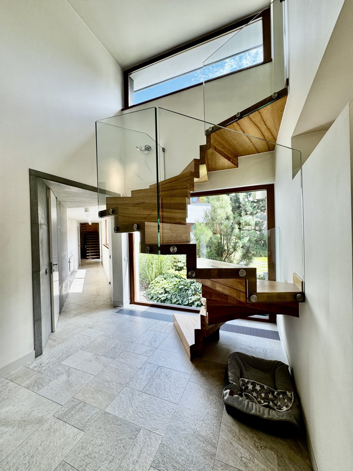 Większą część willi wypełnia dwukondygnacyjny salon, otwarty ogromnymi przeszkleniami na zieleń ogrodu, dzięki czemu wnętrze jest pełne światła i kontaktu z otaczającą naturą. Wszystkie pomieszczenia są jasne, z dużą ilością światła.
