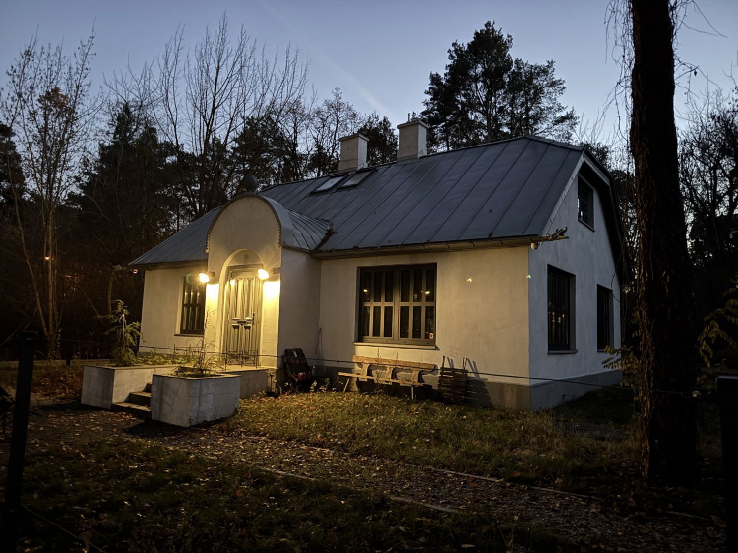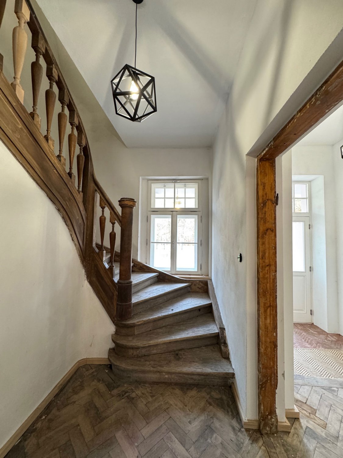Dawny dom ogrodnika ok. 136 m²: salon z otwartą przestrzenią kuchenną, 3 sypialnie, łazienka i WC.