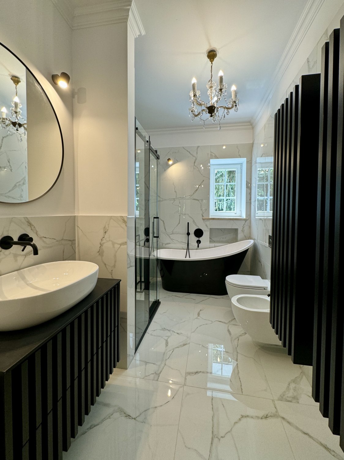 Przyziemie: duża otwarta przestrzeń z kominkiem, druga kuchnia z nowym wyposażeniem, łazienka z wanną i prysznicem, pokój dla gosposi, dwa pomieszczenia gospodarcze, serwerownia z centrum monitoringu.